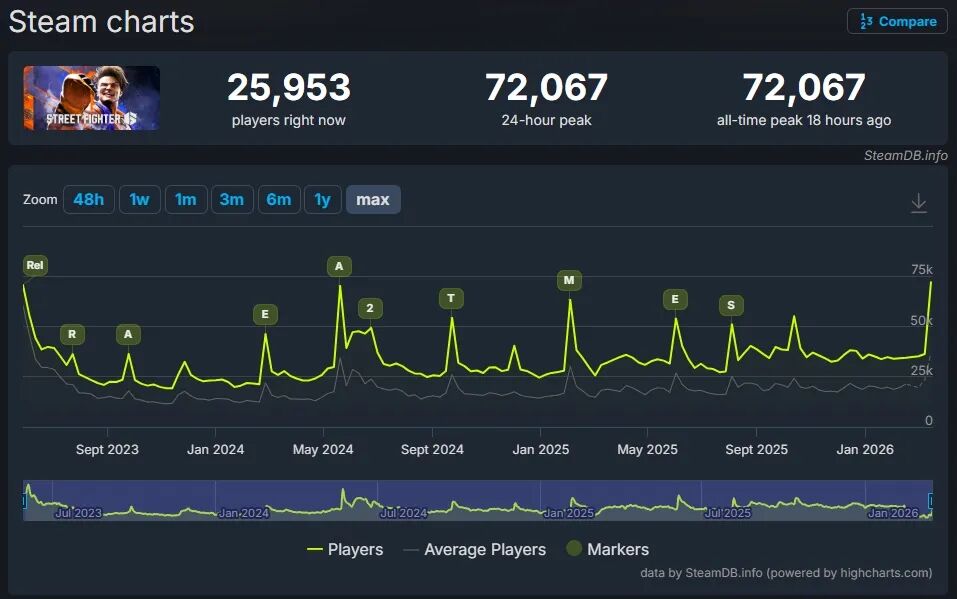 在这样的影响力下,《街霸6》最近这个版本迎来了自己在线用户量的新高峰。在3月18日,也就是新版本上线的第二天,游戏在Steam平台的同时在线量就突破了72000人,这已经超过了游戏刚发售时70000人的在线最高记录。