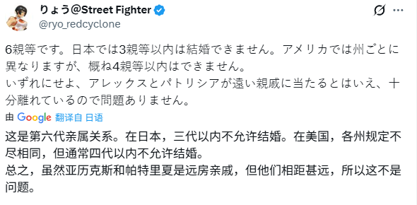 先不说和养父的女儿在一起到底算不算“近亲结婚”,根据卡普空后期的设定,Alex已故的母亲和其养父已经证实了是表兄妹关系,如果按照中国人的理解,帕特丽夏事实上算是Alex的“从表妹”,较真一点的话,两人的关系仍算是稍远一点的亲戚。