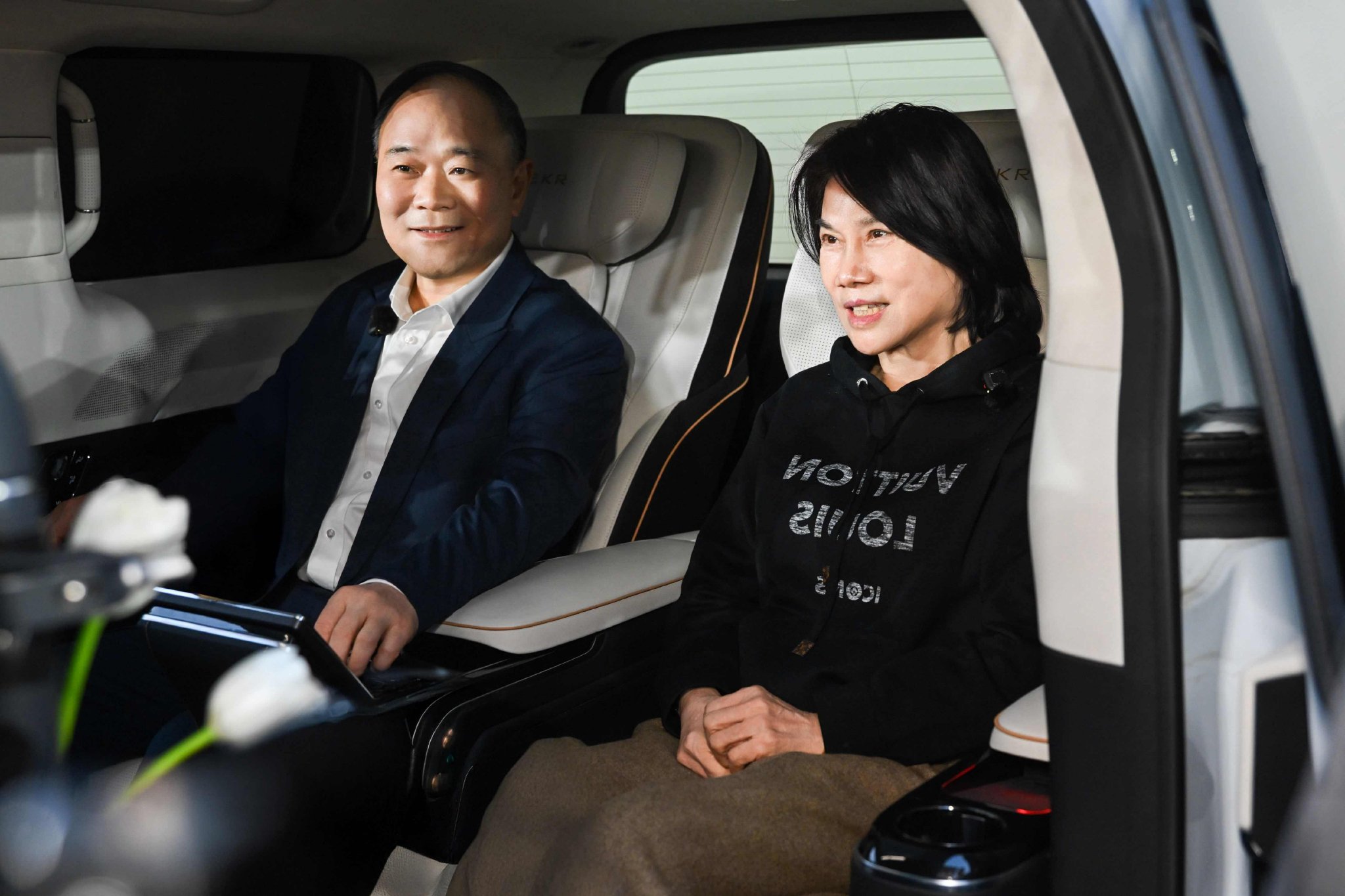 丁磊是最早一批体验者。2022年卡塔尔世界杯期间,一条短视频刷屏:李书福和丁磊两个人,坐在极氪009的第二排,通过15.6英寸的中央吸顶屏观看比赛。“我们一关上门,就是北欧的空气。”