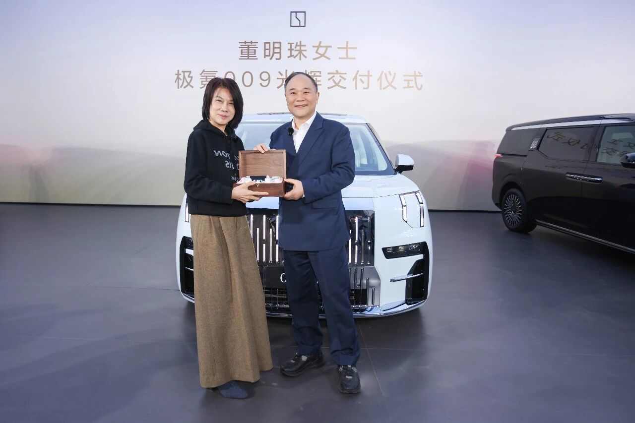 在车里等待的人是李书福,他为董明珠准备了一场简单的交付仪式。一小时后,他将一把“通往幸福和成功”的车钥匙,递到了董明珠手里——是的,“董小姐”买了一辆极氪009。