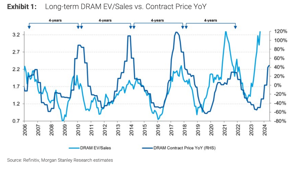 比如1992年10月,美国对韩实施反倾销税,导致1兆内存条价格从20美元飙至80美元,行业步入高峰期;