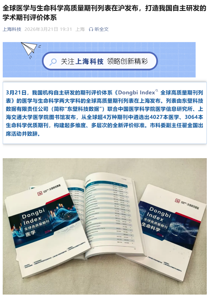 据“上海科技”公众号介绍,列表由东壁科技数据有限责任公司(简称“东壁科技数据”)联合中国医学科学院医学信息研究所、上海交通大学医学院图书馆发布,从全球超 4 万种期刊中遴选出 4027 本医学、3064 本生命科学优质期刊,构建起多维度、多层次的全新评价标准。
