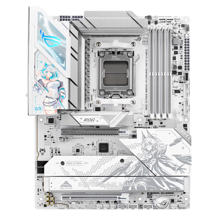 这款主板主打全白二次元设计,PCB、插槽、散热装甲及配件均为纯白配色,同时,IO装甲融入国行特供的吹雪姬双层立绘,搭配曲线光纹铭板与ARGB神光同步,完美适配白色海景房主机。性能层面,主板搭载14+2+2相80A供电模组,轻松驾驭锐龙9000系处理器,新增异步时钟发生器提升超频灵活性。