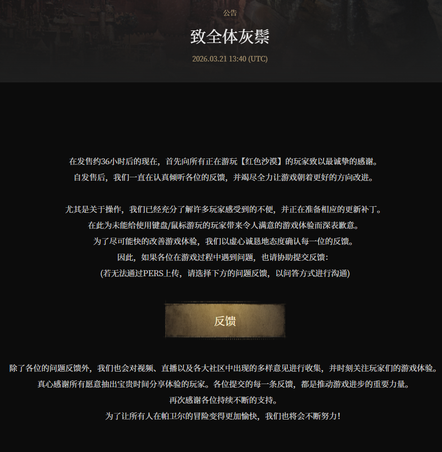 IT之家 3 月 21 日消息,今日,《红色沙漠》游戏官方发布公告称,在发售约 36 小时后的现在,首先向所有正在游玩《红色沙漠》的玩家致以最诚挚的感谢。自发售后,团队一直在认真倾听各位的反馈,并竭尽全力让游戏朝着更好的方向改进。