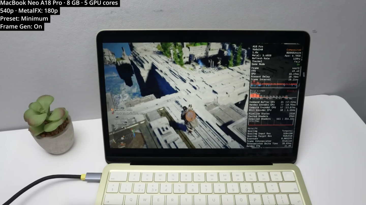 随后博主开始拿出笔记本进行测试。他首先将游戏的所有画质选项降到最低,使用 MetalFX 将 180P 分辨率提升至 540P 并开启帧生成技术,MacBook Neo 能在这样的“拼好帧”状态下达到 50 FPS 帧率。