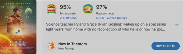 由于该片的制作成本高达2亿美元,《拯救计划》需要在未来几周连续霸榜才能拯救自己。好在影片口碑不错,烂番茄指数95%,观众口碑更高达97%,为票房成绩保驾护航。