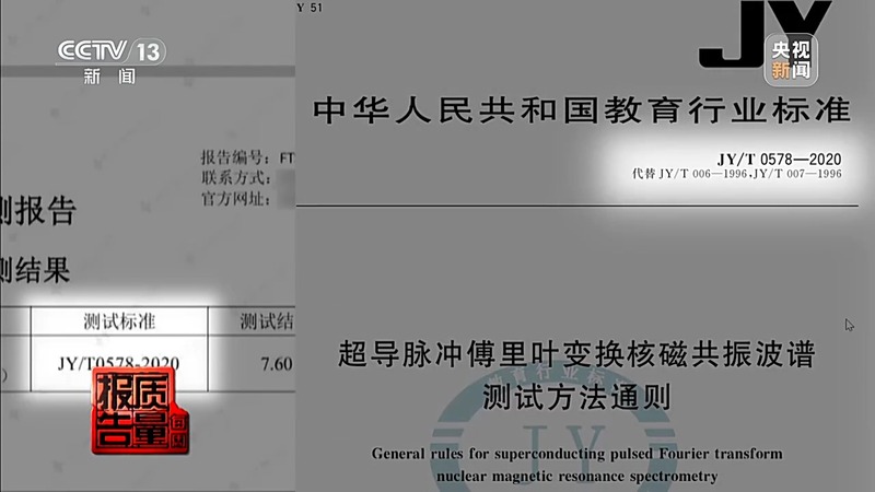 飞凡检测的工程师证实,产品没有检测标准,检测报告上标注的是测试方法的标准。测试方法的标准号为JY/T0578-2020,记者查询发现,这一标准编号对应的是由教育部发布的《超导脉冲傅里叶变换核磁共振波谱测试方法通则》。