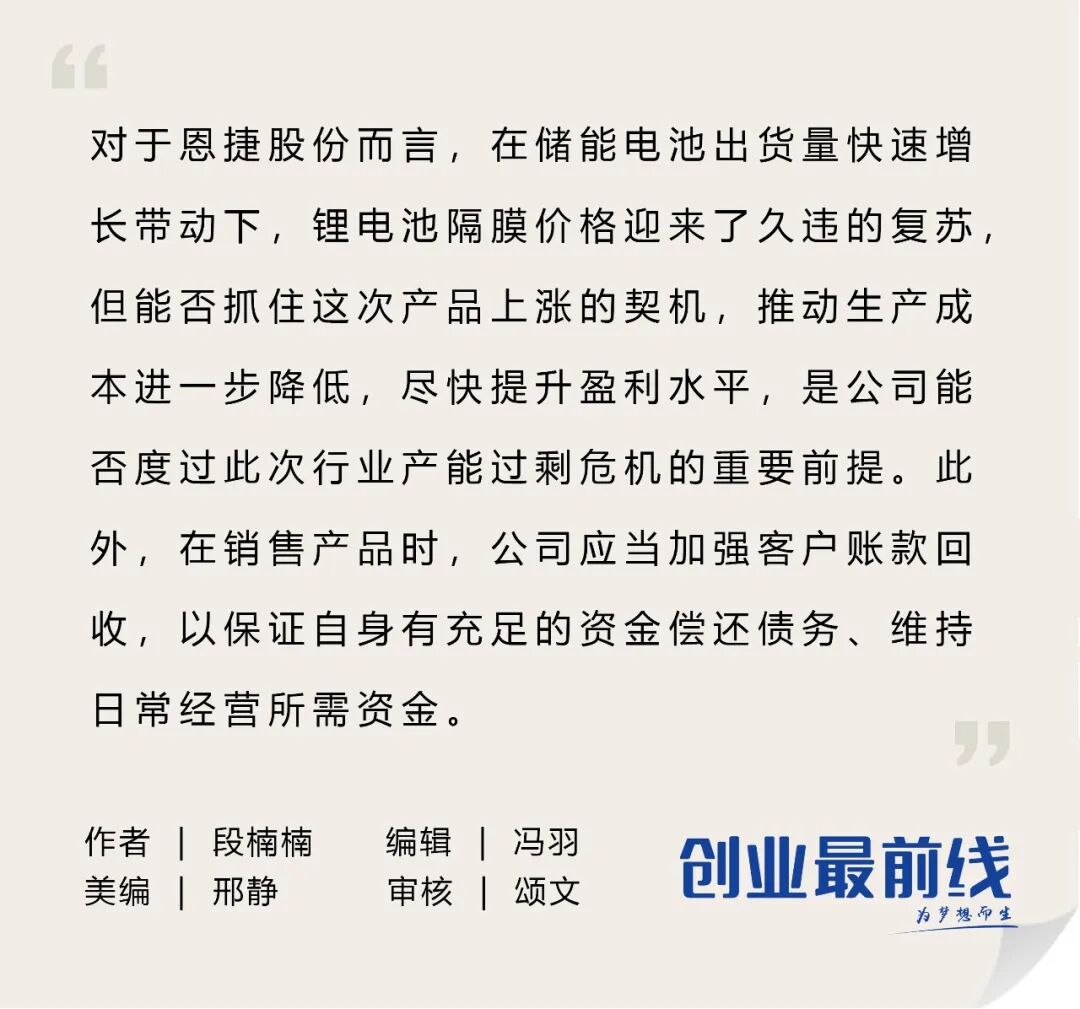 对于恩捷股份而言,在储能电池出货量快速增长带动下,锂电池隔膜价格迎来了久违的复苏,但能否抓住这次产品上涨的契机,推动生产成本进一步降低,尽快提升盈利水平,是公司能否度过此次行业产能过剩危机的重要前提。此外,在销售产品时,公司应当加强客户账款回收,以保证自身有充足的资金偿还债务、维持日常经营所需资金。