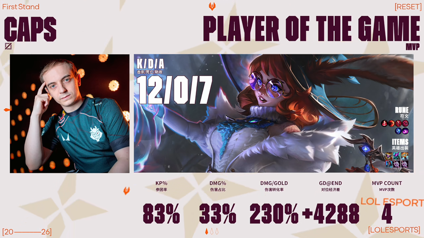 20 分钟,G2 先开大龙逼团,Caps 冰鸟大招减速多人,G2 完成一换三。
