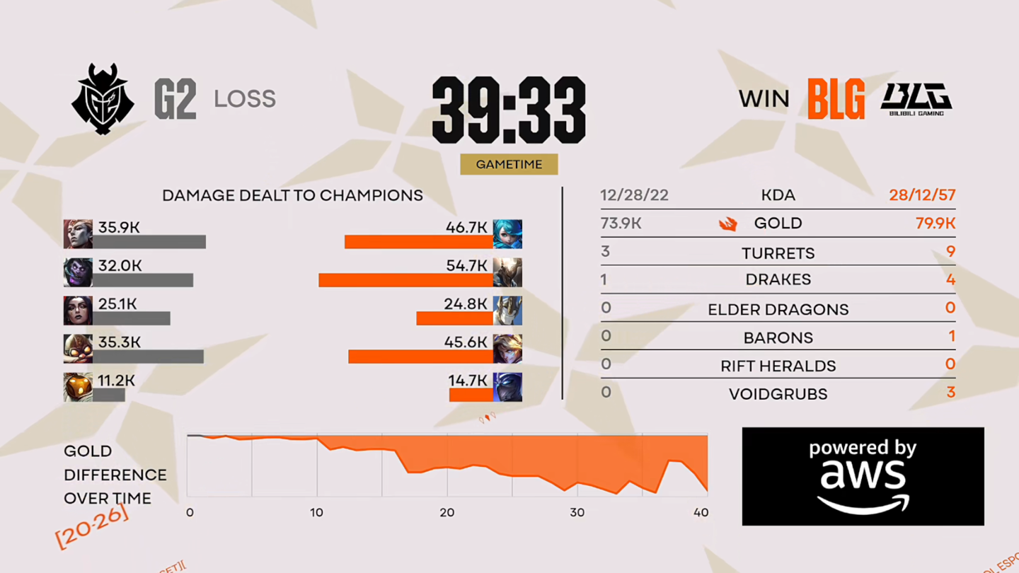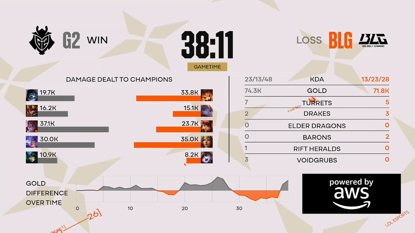 38 分钟,BLG 先手击杀蒙多,推上高地后再击杀亚恒,随后 BLG 团灭 G2,点掉 G2 水晶。