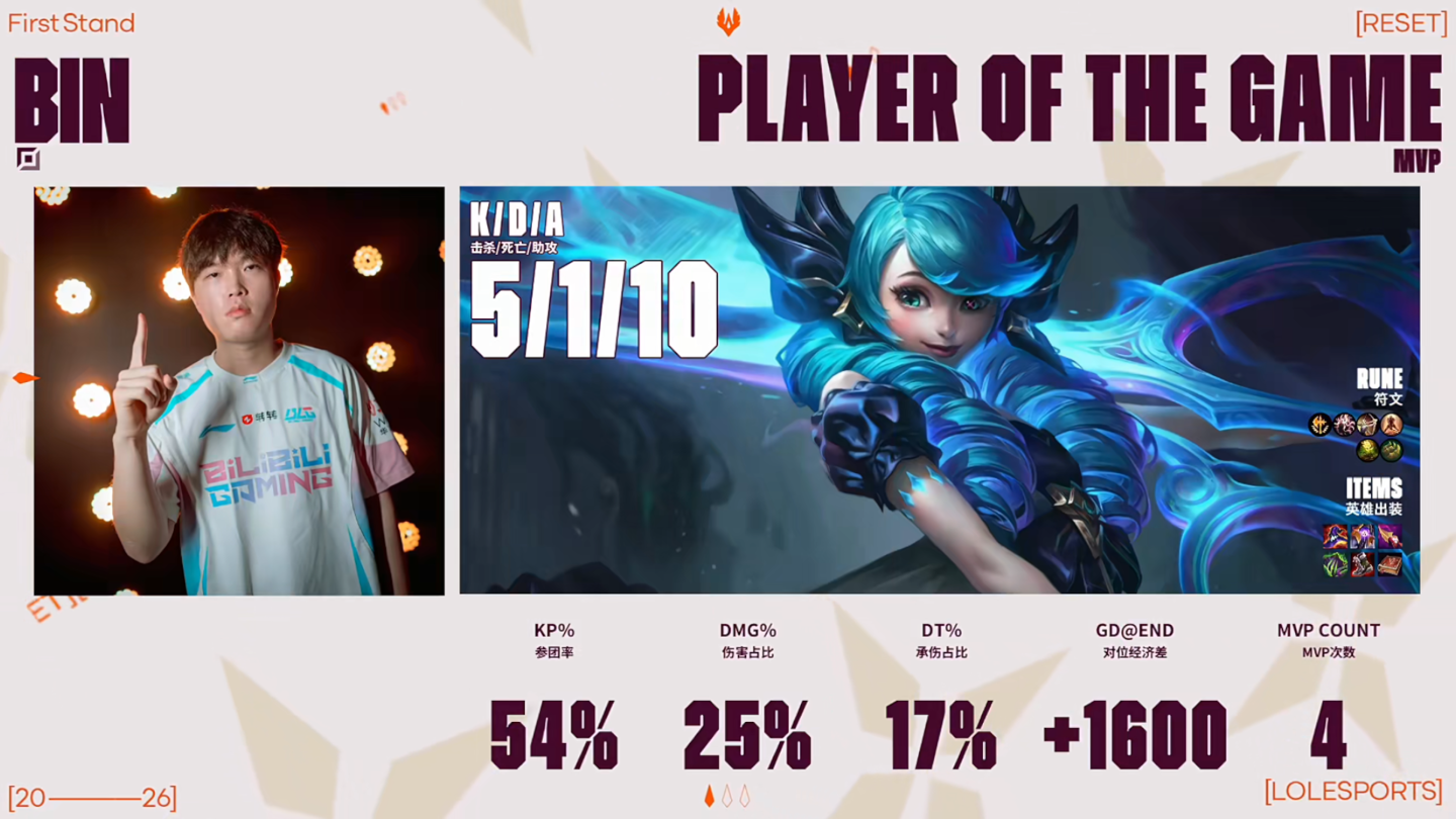 15 分钟,Bin 格温一打三留人,ON 慎关键 E 嘲住妖姬,BLG 完成零换三。