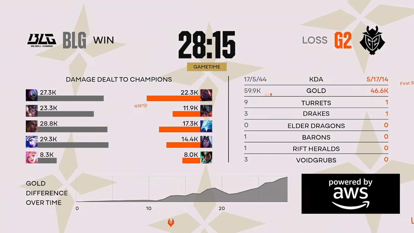 25 分钟,Bin 青钢影大到孙悟空,再钩索追击,Knight 蛇女石化到卡莎,收获双杀,随后推掉 G2 基地。恭喜 BLG 赢得比赛,获得本次先锋赛冠军。
