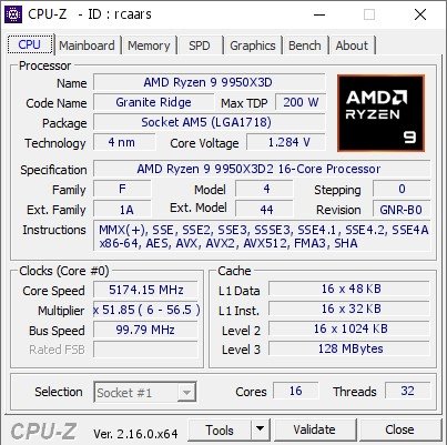 CPU-Z验证页面显示,该处理器的型号名称为AMD Ryzen 9 9950X3D2,L3缓存标注为96 + 32 MB,合计128MB,最大TDP为200W,而已发布的锐龙9 9950X3D的TDP为170W。