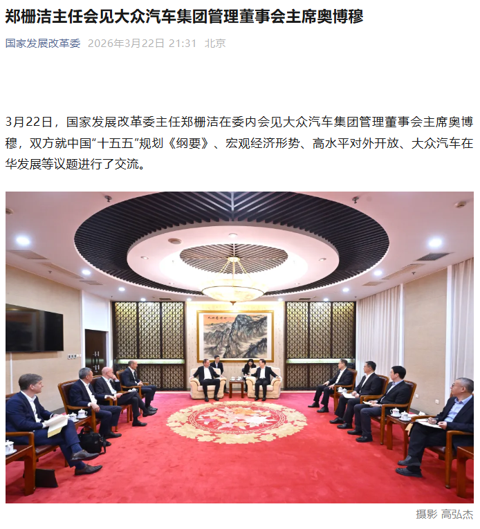 IT之家 3 月 22 日消息,今日,国家发展改革委主任郑栅洁在委内会见大众汽车集团管理董事会主席奥博穆,双方就中国“十五五”规划《纲要》、宏观经济形势、高水平对外开放、大众汽车在华发展等议题进行了交流。