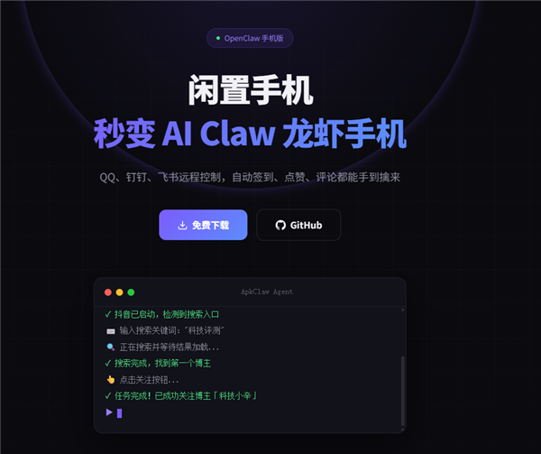 目前,ApkClaw已经同步开放官网(https://apkclaw.ai/)与GitHub开源仓库下载(https://github.com/apkclaw-team/ApkClaw)。