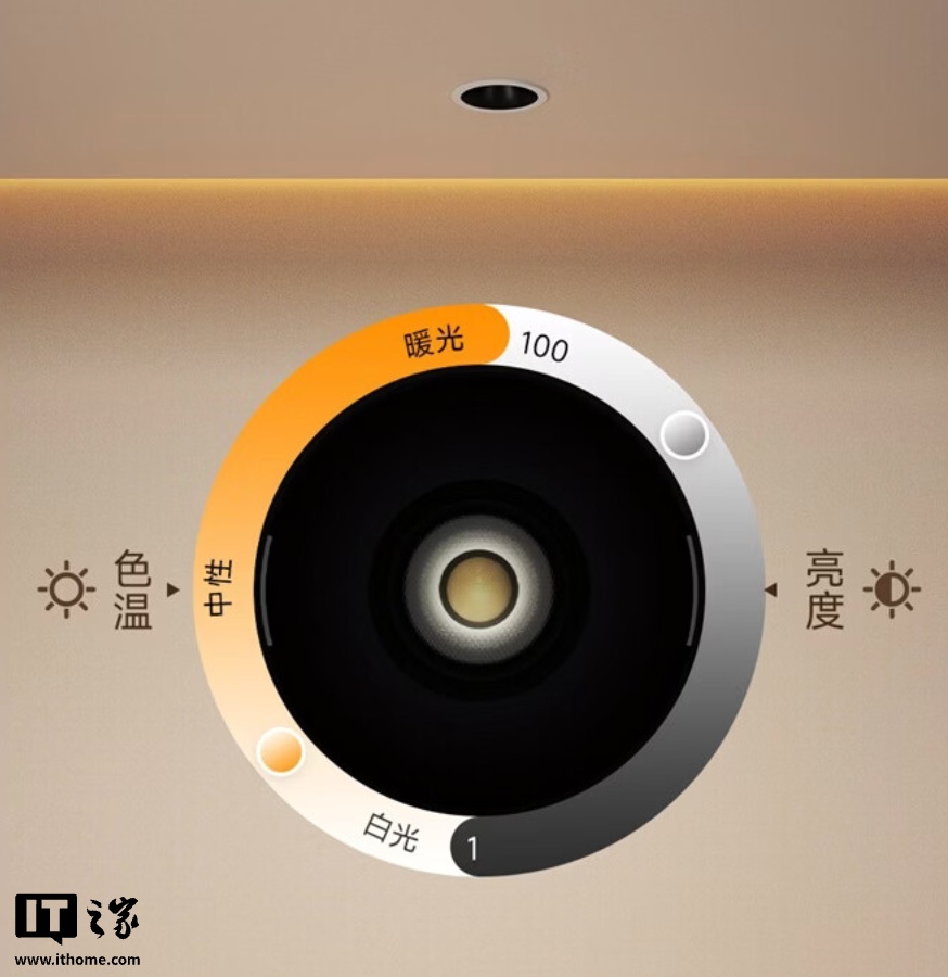 该筒射灯支持 0-25 度角度自由调节,采用 8mm 窄边框设计,能够提供全光谱照明,实现 Ra97 高显指色彩。同时该灯支持色温亮度无级调节,覆盖 2700K-6500K 色温,可用小米米家 App 便捷调参。