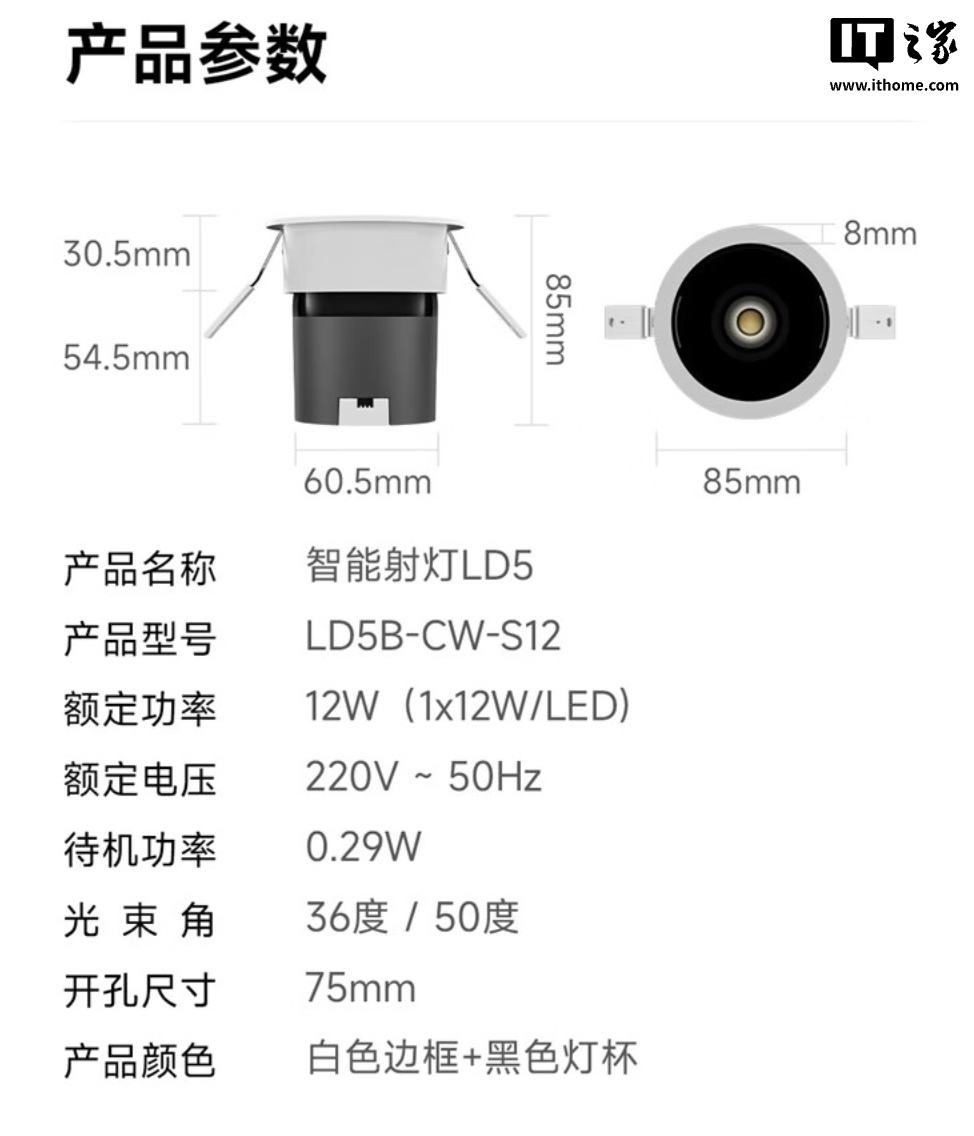 该筒射灯搭载蓝牙 Mesh 2.0 满血版,支持多物理灯组(最多 32 个物理组),功率达 12W,可实现 600lm 光通量,日常待机时功耗约 0.29W。