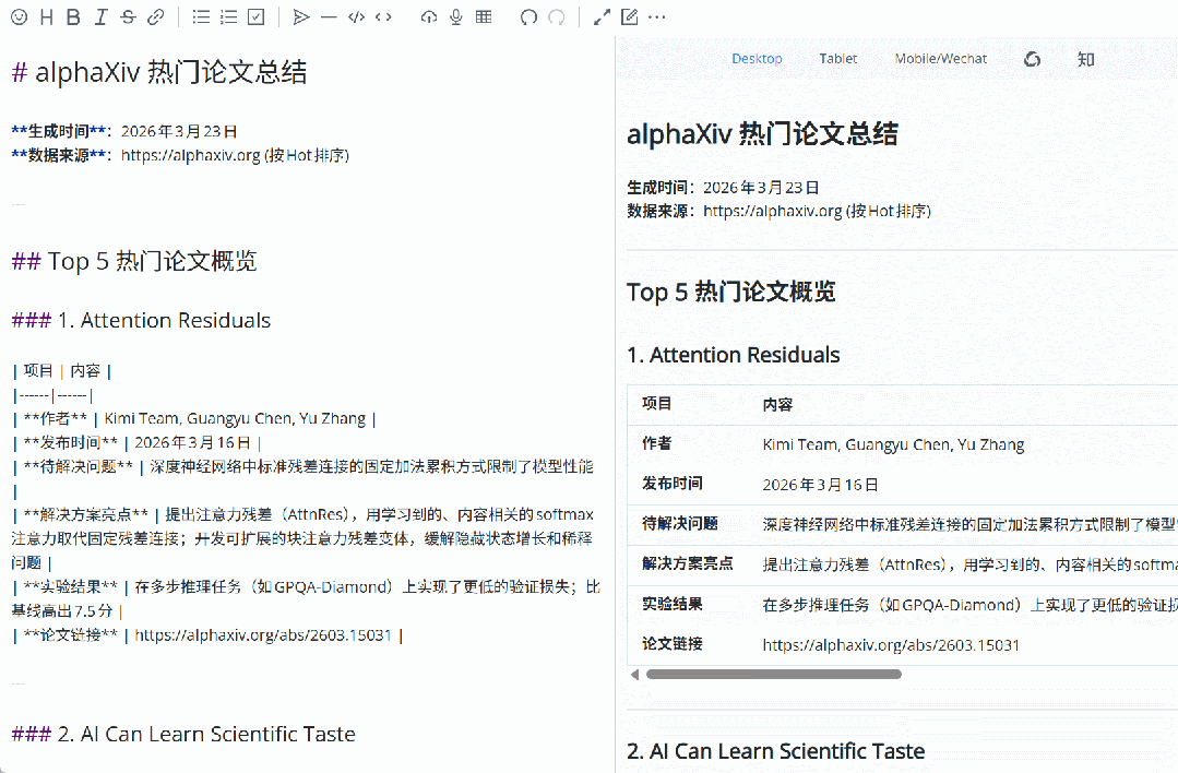 最终效果如下所示:WorkBuddy 生成的文件条理非常清晰,信息被严格按结构拆分,每篇论文都围绕待解决问题、解决方案亮点、实验结果和论文链接展开,让人一眼就能抓住重点。