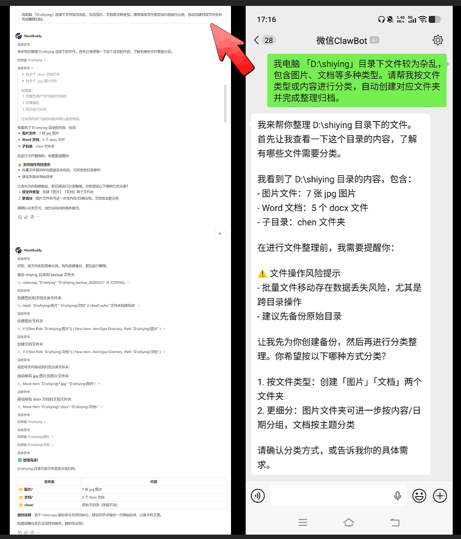 接下来,我们 通过微信 ClawBot 远程操控电脑,整理杂乱的文件 。