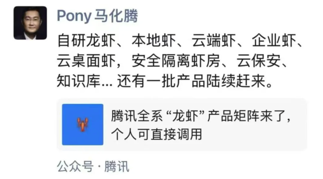 OpenClaw 再次掀起的这场 Agent 军备竞赛中,如果要选出动作最密集、覆盖面最广的互联网巨头,腾讯可以说是当仁不让。马化腾描绘的腾讯「龙虾矩阵」,已经说明了一切。