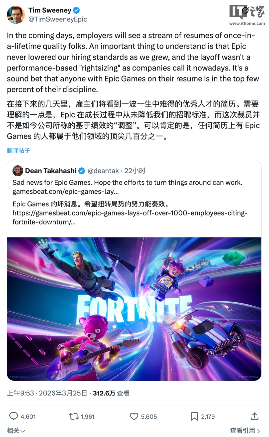 IT之家 3 月 25 日消息,今天早些时候,Epic Games 宣布裁员超过 1000 人。对此,CEO 蒂姆 · 斯威尼表示,此举是因为公司支出高于收入,同时《堡垒之夜》用户参与度正在下滑。