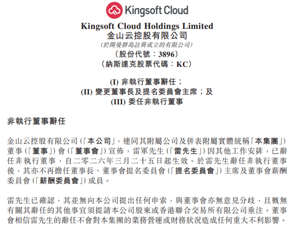 金山云:雷军因其他工作安排辞任非执行董事