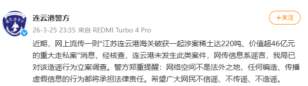 新京报讯 据@连云港警方 微博消息,近期,网上流传一则“江苏连云港海关破获一起涉案稀土达220吨、价值超46亿元的重大走私案”消息,经核查,连云港未发生此类案件,网传信息系谣言,连云港市公安局已对该造谣行为立案调查。警方郑重提醒:网络空间不是法外之地,任何编造、传播虚假信息的行为都将承担法律责任。希望广大网民不信谣、不传谣、不造谣。