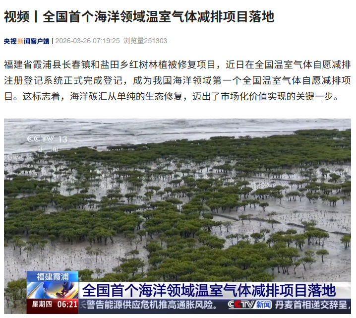 IT之家 3 月 26 日消息,据央视新闻报道,福建省霞浦县长春镇和盐田乡红树林植被修复项目,近日在全国温室气体自愿减排注册登记系统正式完成登记,成为我国海洋领域第一个全国温室气体自愿减排项目(CCER)。这标志着,海洋碳汇从单纯的生态修复,迈出了市场化价值实现的关键一步。