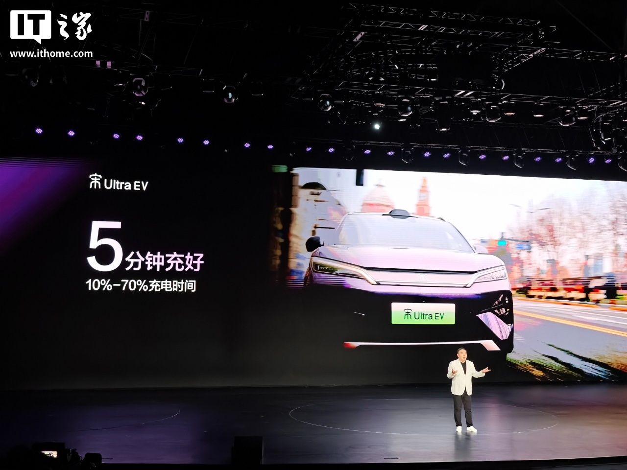 IT之家 3 月 26 日消息,在今天(3 月 26 日)召开“闪充一下宋弛出发”活动中,比亚迪宋 Ultra EV 带来全新闪充技术,全系搭载第二代刀片电池,常温下 5 分钟可充至 70% 电量(约 400km 续航),9 分钟充至 97%;零下 30℃ 极寒环境充电仅比常温多 3 分钟。