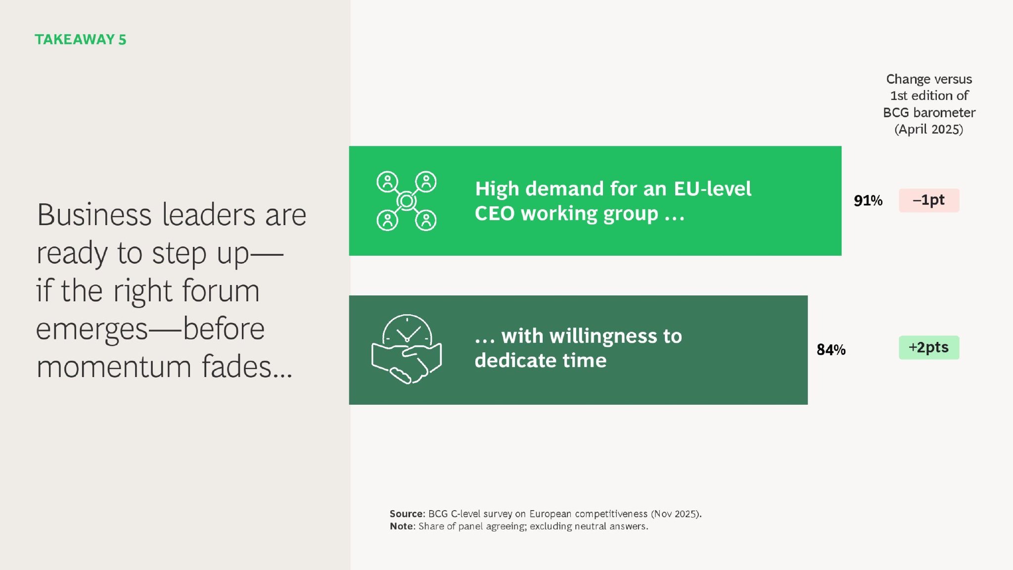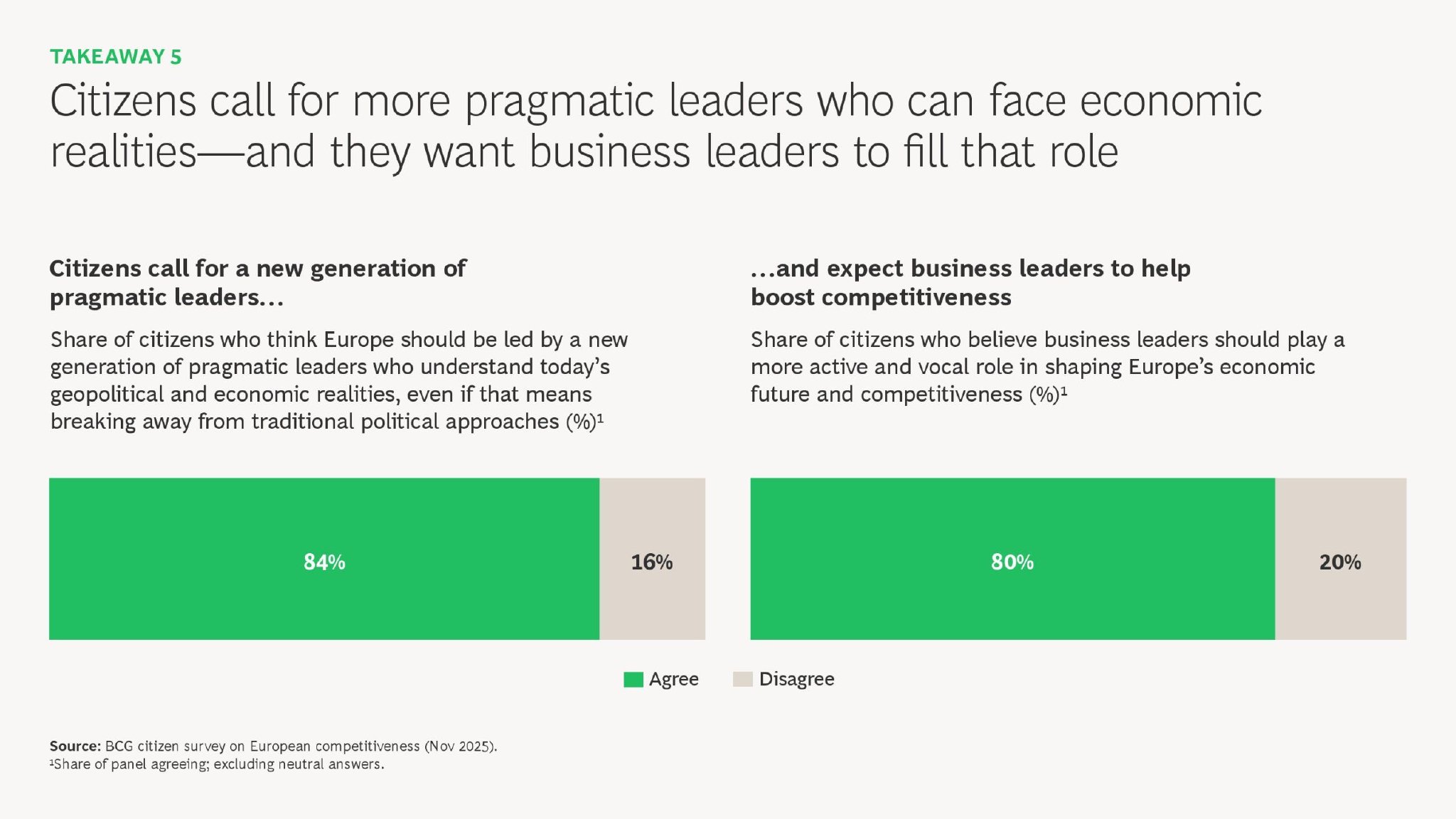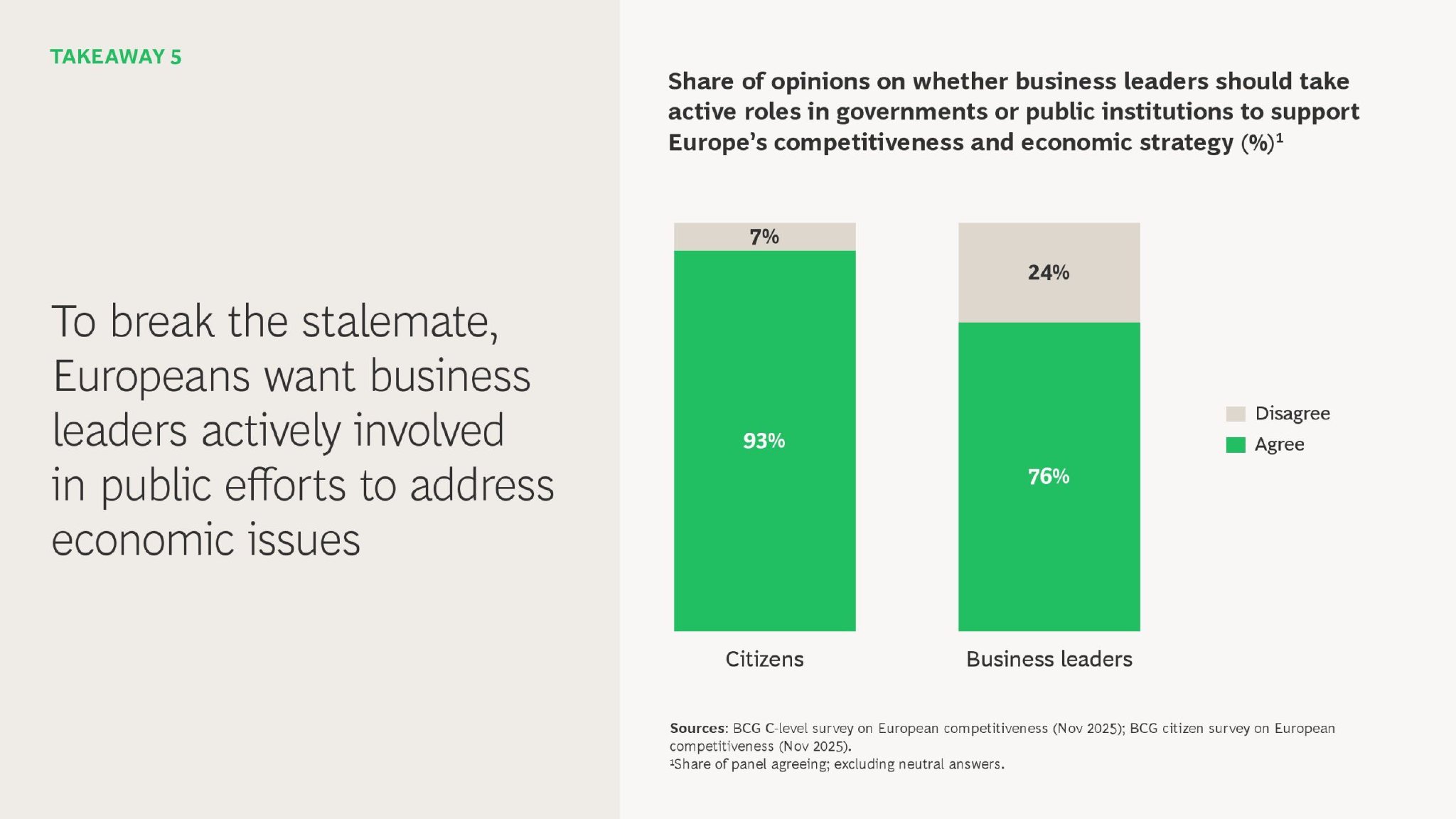 在治理结构上,企业角色被显著强化。93%的企业高管与76%的公众支持企业领导者更积极参与公共事务,80%的公众希望企业在塑造欧洲经济未来中发挥更直接作用,84%呼吁由更务实的新一代领导者主导改革。同时,91%的企业支持建立欧盟层面的CEO协作机制,84%愿意投入时间参与。然而,64%的企业仍受制于声誉风险,54%担忧政治报复,制度性参与障碍依然存在。