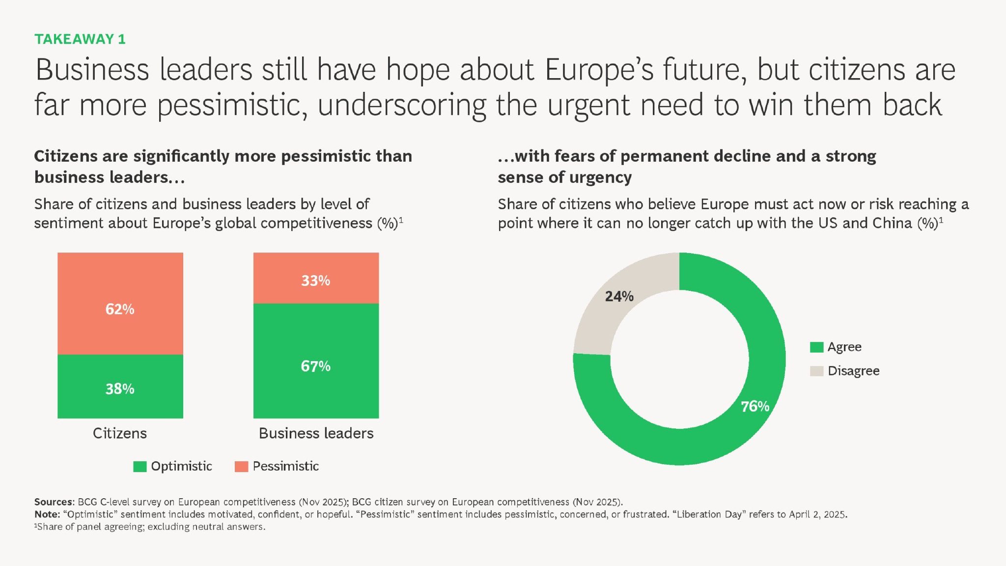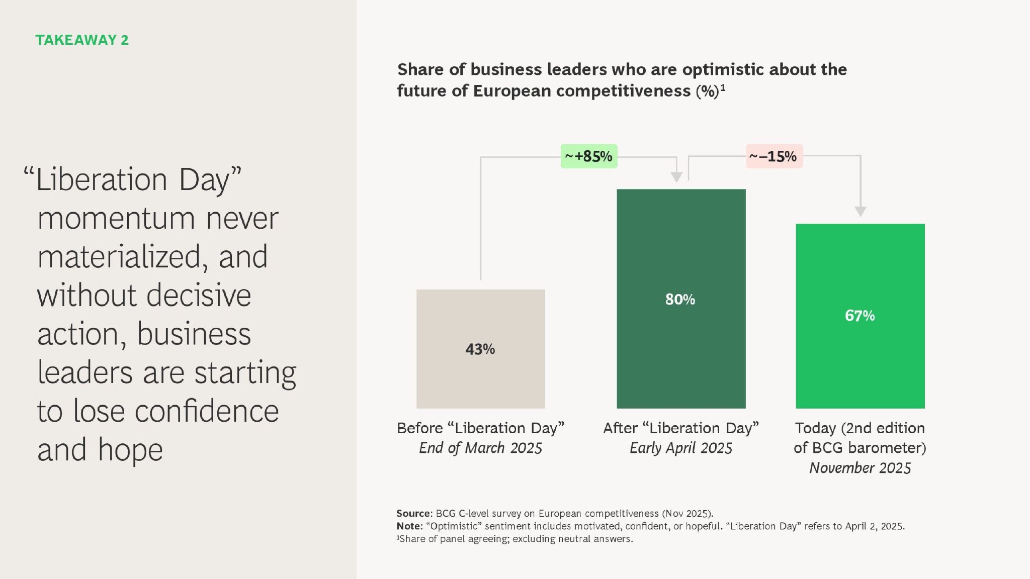 尽管方向一致,信心结构却出现明显分化。公众情绪显著悲观,仅38%的公众对欧洲竞争力持乐观态度,而企业端仍有62%保持相对积极。76%的公众认为若不立即采取行动,欧洲将面临不可逆的长期落后风险。同时,企业信心亦在快速回落,“解放日”后的乐观比例由80%降至67%,进一步下滑至43%,显示政策预期未能兑现。区域层面,德国企业信心降幅最为显著,反映核心经济体对未来路径的不确定性正在放大。