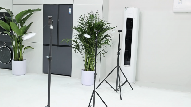 不仅如此,我们还对柜机的超广域送风能力做了测试。为了测试它的送风效果,我们在距离风口1米、3米、5米的位置依次用羽毛进行测试,可以看到不论远近、无论是房间哪个角落,羽毛都能被风吹动,且风感柔和。我们实际体感也觉得它像自然风一样拂过,不会有硬风直吹肩颈的刺痛感,这下家里有老人、小孩的,再也不用担心吹空调着凉了。