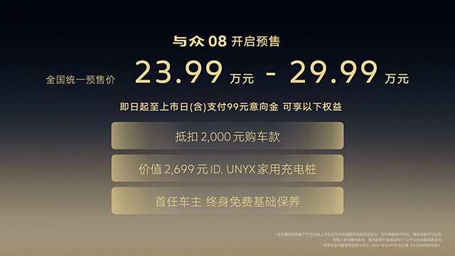 2026年3月26日,合肥,作为强大产品攻势的序幕,金标大众家族全新成员——首款全时互联全尺寸纯电SUV与众08在合肥完成首秀,并同步开启预售,预售价格为23.99万元-29.99万元。新车推出了限时预售权益。即日起,用户支付99元意向金,即可尊享三重礼遇:99元意向金直接抵扣2000元购车款;首任车主终身免费基础保养;赠送价值2,699元ID.UNYX家用充电桩。目前,与众08已陆续进入金标大众门店,客户可于门店预约试驾体验。