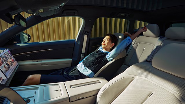 车辆为副驾打造了专属的“舒享空间”:配备电动腿托的座椅支持12向电动调节,并集成了气动腰托、通风、加热及10点气动按摩功能;靠背可放倒至120°形成零重力舒享躺姿,更可舒展至180°秒变大床;配合超宽柔光4500K暖白光化妆镜与独立的15英寸娱乐屏,营造出女王般的尊享体验。