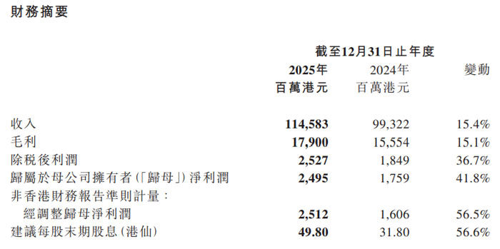 2025 年,TCL 电子实现营收 1145.83 亿港元,较 2024 年的 993.22 亿港元同比增长 15.4%;毛利达 179.00 亿港元,同比增长 15.1%;除税后利润 25.27 亿港元,同比增长 36.7%;归属于母公司拥有者净利润 24.95 亿港元,同比大幅增长 41.8%;经调整归母净利润 25.12 亿港元,同比飙升 56.5%。为回馈股东,公司建议派发末期股息每股 49.80 港仙,较 2024 年的 31.80 港仙增长 56.6%,派息率达经调整归母净利润的约 50%,持续践行高派息政策。