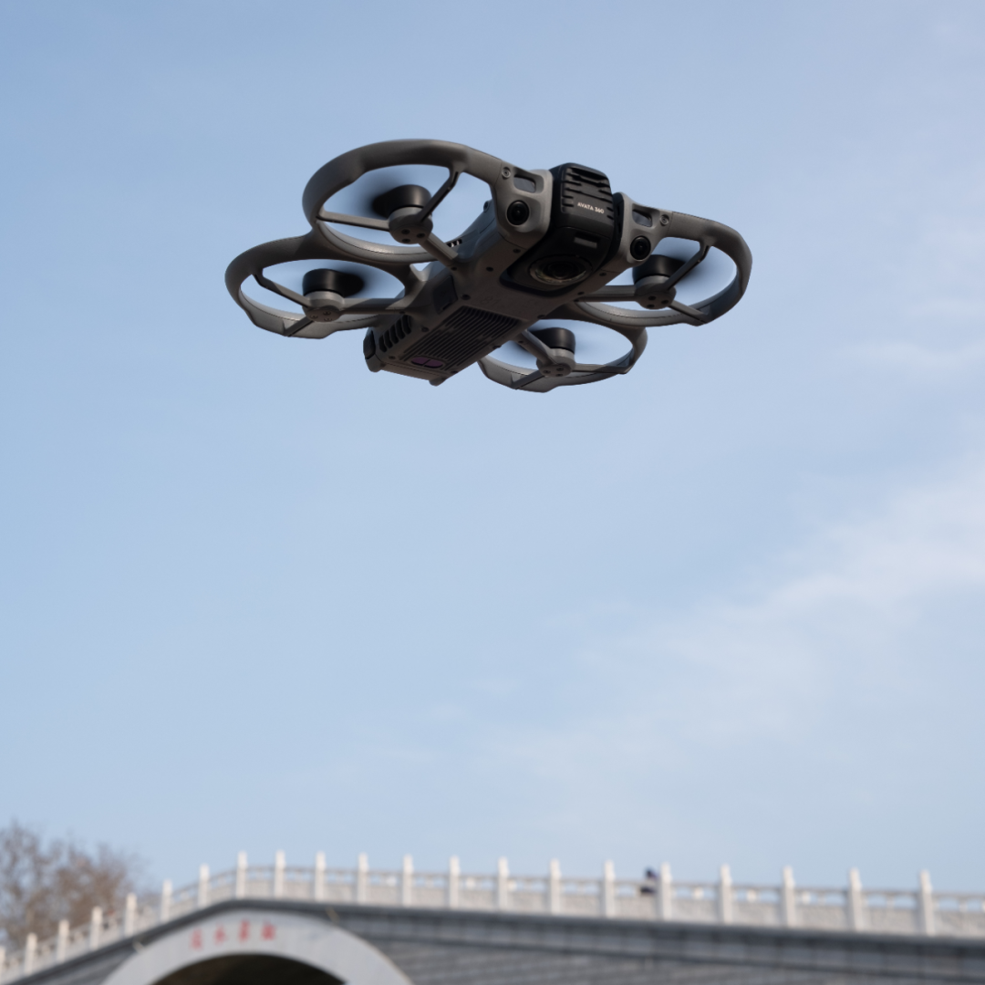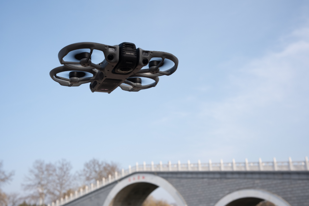 Avata 360 的全向避障系统支持 1 lux 暗光环境下工作,前向配备激光雷达,纯黑环境仍可识别前方障碍物并刹停。一体化全包桨保让机身可以贴近拍摄目标,骑行、车拍、人群环境里,周围的人也不会害怕。