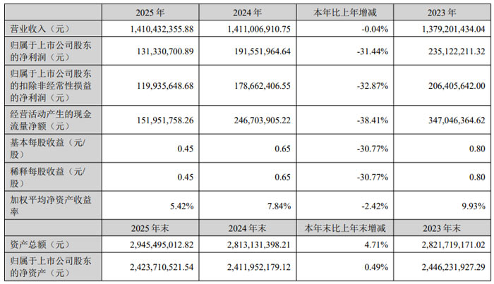 财务状况方面,截至 2025 年末,公司资产总额达 29.45 亿元,较上年末增长 4.71%;归属于上市公司股东的净资产 24.24 亿元,较上年末增长 0.49%,资产负债结构稳健。公司注重股东回报,拟以现有总股本 29185.54 万股为基数,向全体股东每 10 股派发现金红利 2 元(含税),现金分红金额达 0.58 亿元,充分体现了对股东的责任感。
