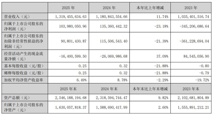 2026 年 3 月,北京高盟新材料股份有限公司(股票简称:高盟新材,股票代码:300200)发布 2025 年年度报告。报告显示,公司全年实现营业收入 13.19 亿元,同比增长 11.74%;归属于上市公司股东的净利润 1.04 亿元,同比下降 23.18%;归属于上市公司股东的扣除非经常性损益的净利润 0.91 亿元,同比下降 21.39%;基本每股收益 0.25 元。