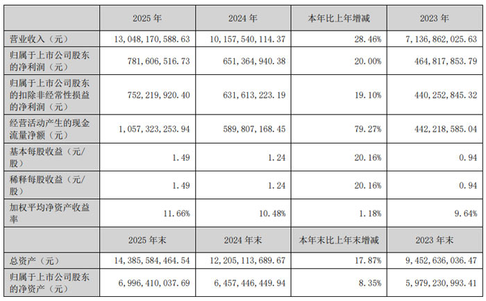 2025 年,华阳集团实现营业收入 130.48 亿元,同比增长 28.46%;归属于上市公司股东的净利润 7.82 亿元,同比增长 20.00%;归属于上市公司股东的扣除非经常性损益的净利润 7.52 亿元,同比增长 19.10%;基本每股收益 1.49 元,同比增长 20.16%。