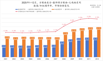 2025年7月起,康师傅火鸡面系列的数值铺市率和加权铺市率双双开始明显上涨,此后几乎每个月都在“上台阶”。铺货率的变化反映在市场份额上,下半年两者数值增长节奏高度吻合。