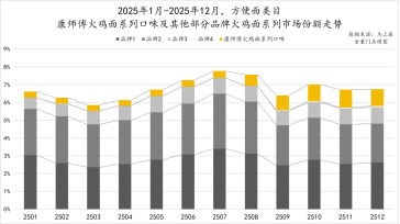 自2025年7月、8月起,康师傅火鸡面系列市场份额出现明显跃升,并在此后保持了增长态势与份额,对其他品牌的火鸡面系列产品形成了明显的挤压。以2025年12月,康师傅的火鸡面系列市场份额对比年初,系列市场份额翻了一倍有余。