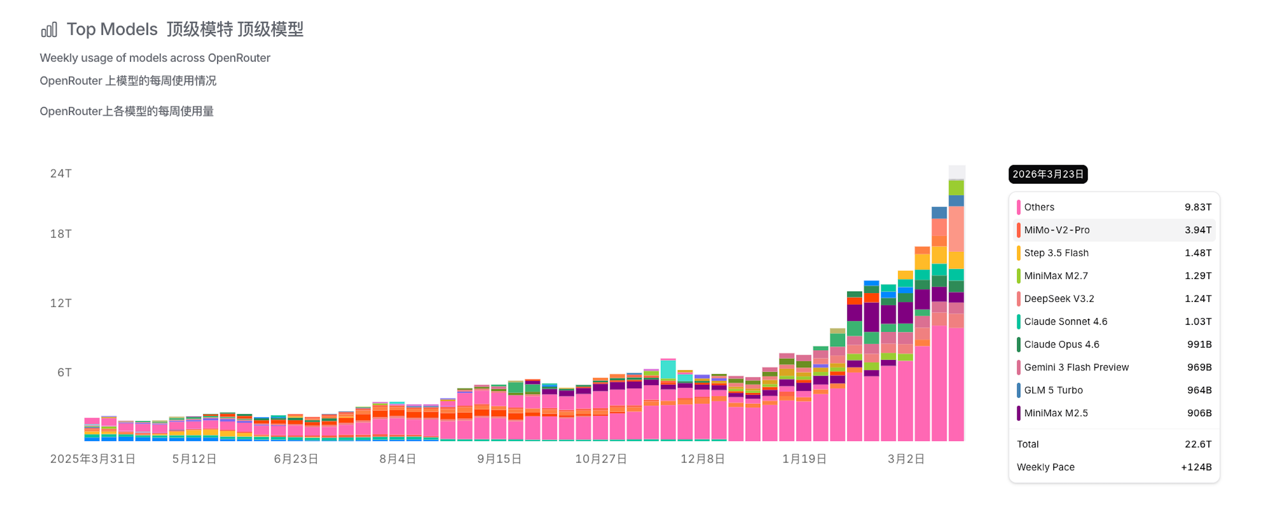 3月30日,据全球大模型聚合路由平台OpenRouter,上周(3.23-3.29)全球模型调用量排名榜中,国产大模型调用量连续一个月超过海外模型。