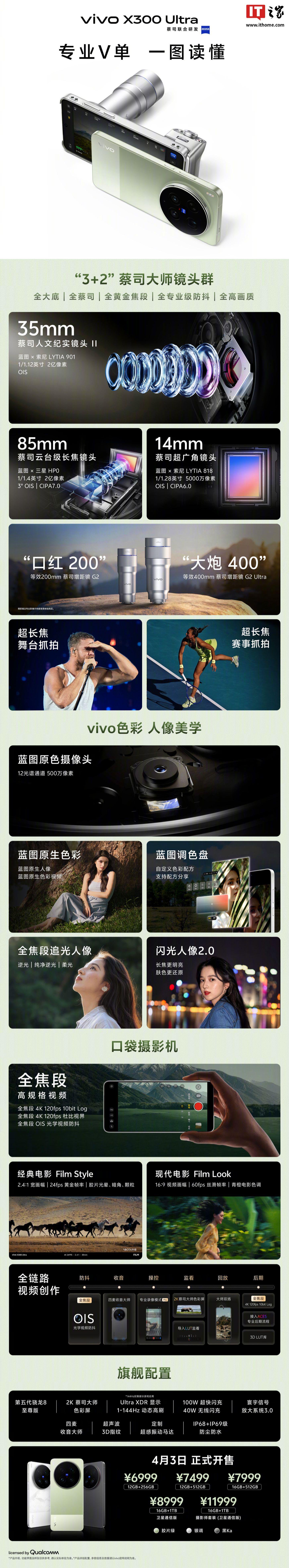 IT之家 3 月 30 日消息,在今天的 vivo X 系列春季新品发布会上,vivo X300 Ultra 手机正式发布。新机号称「专业 V 单」,搭载第五代骁龙 8 至尊版处理器、拥有 3+2 蔡司大师镜头群,售价 6999 元起。
