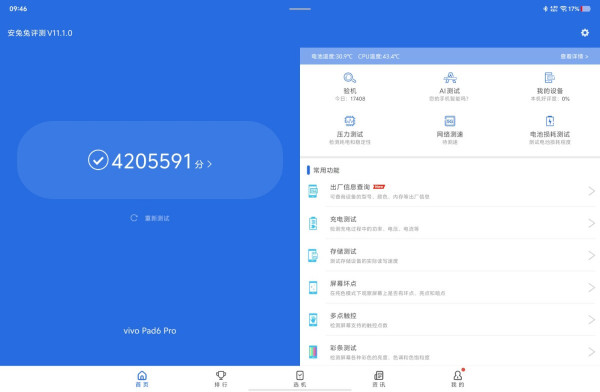 强悍的性能是全能体验的基础,vivo Pad6 Pro搭载第五代骁龙8至尊版处理器,采用先进3nm制程工艺,相比前代性能大幅提升、功耗显著优化,安兔兔综合跑分超420W,配合LPDDR5X运存与UFS4.1疾速闪存,多任务并行、重载应用运行、大型游戏畅玩都毫无压力。而且为了让性能持续稳定释放,vivo Pad6 Pro配备VC立体散热系统,搭配Monster超核引擎,深度联合高通调校,实现超稳、超猛、超流畅的性能表现。