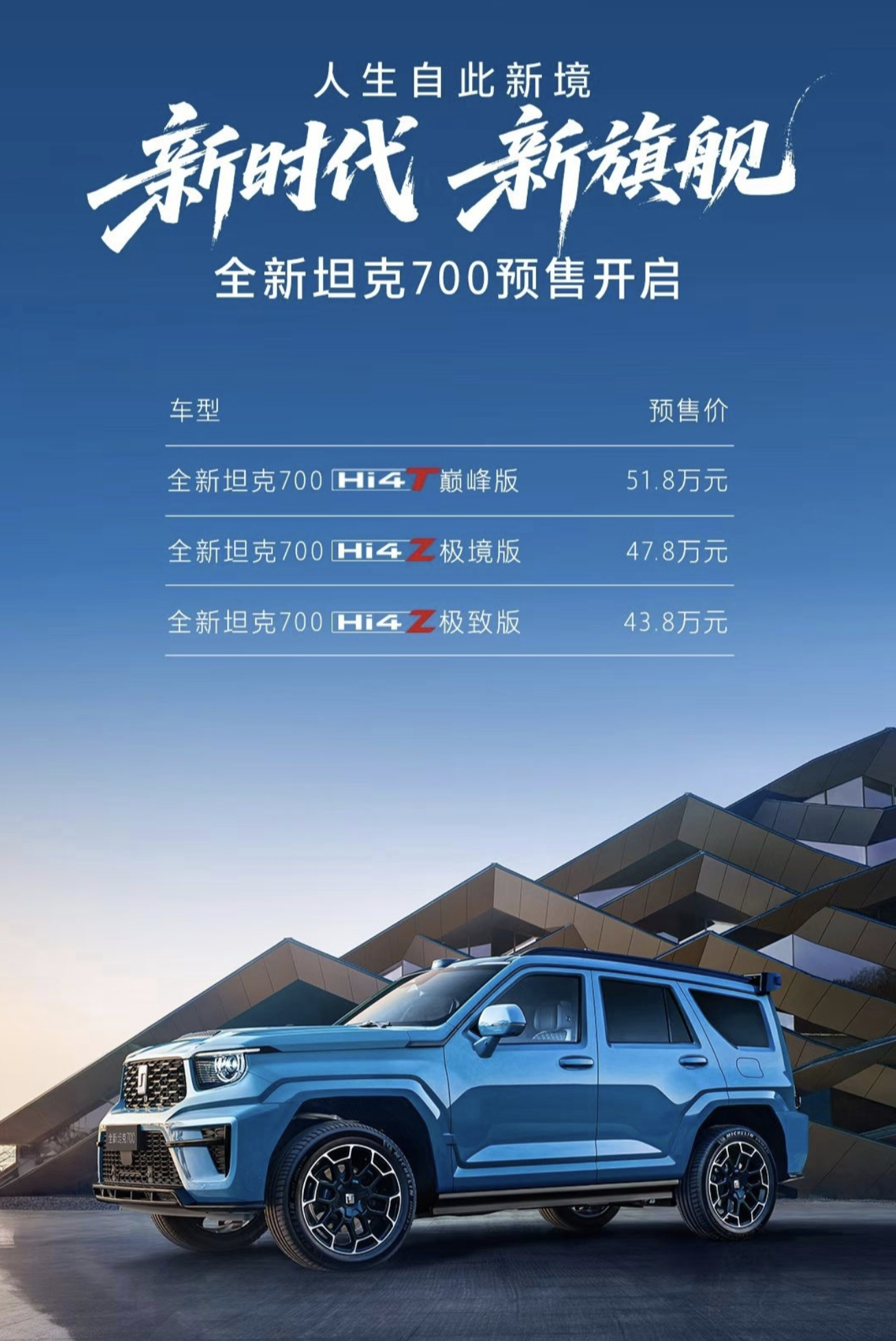 IT之家 3 月 30 日消息,长城汽车旗下 2026 款坦克 700 Hi4-T/Hi4-Z 今天的发布会中正式开启预售,系列车型共推出 3 款版本,预售价为 43.8 万元起,IT之家整理价格信息如下: