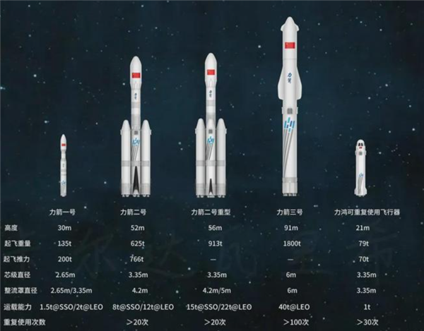 500公里太阳同步轨道运载能力8吨,200公里近地轨道运载能力12吨,具有运载能力大、固有可靠性高、可制造性强、操作简洁便利、拓展空间强、可重复使用等优势。