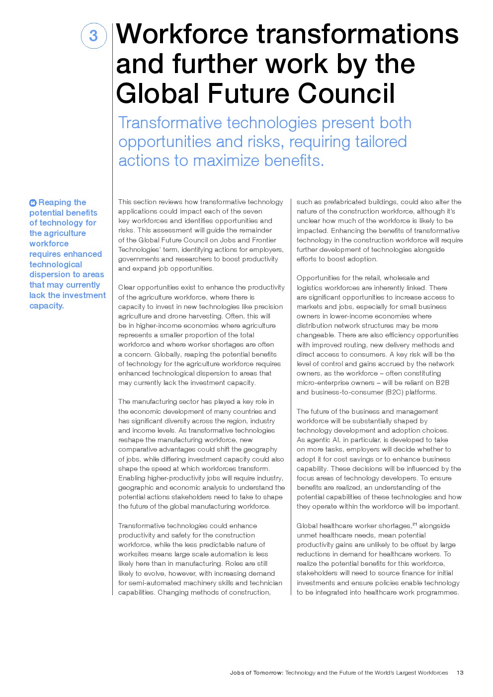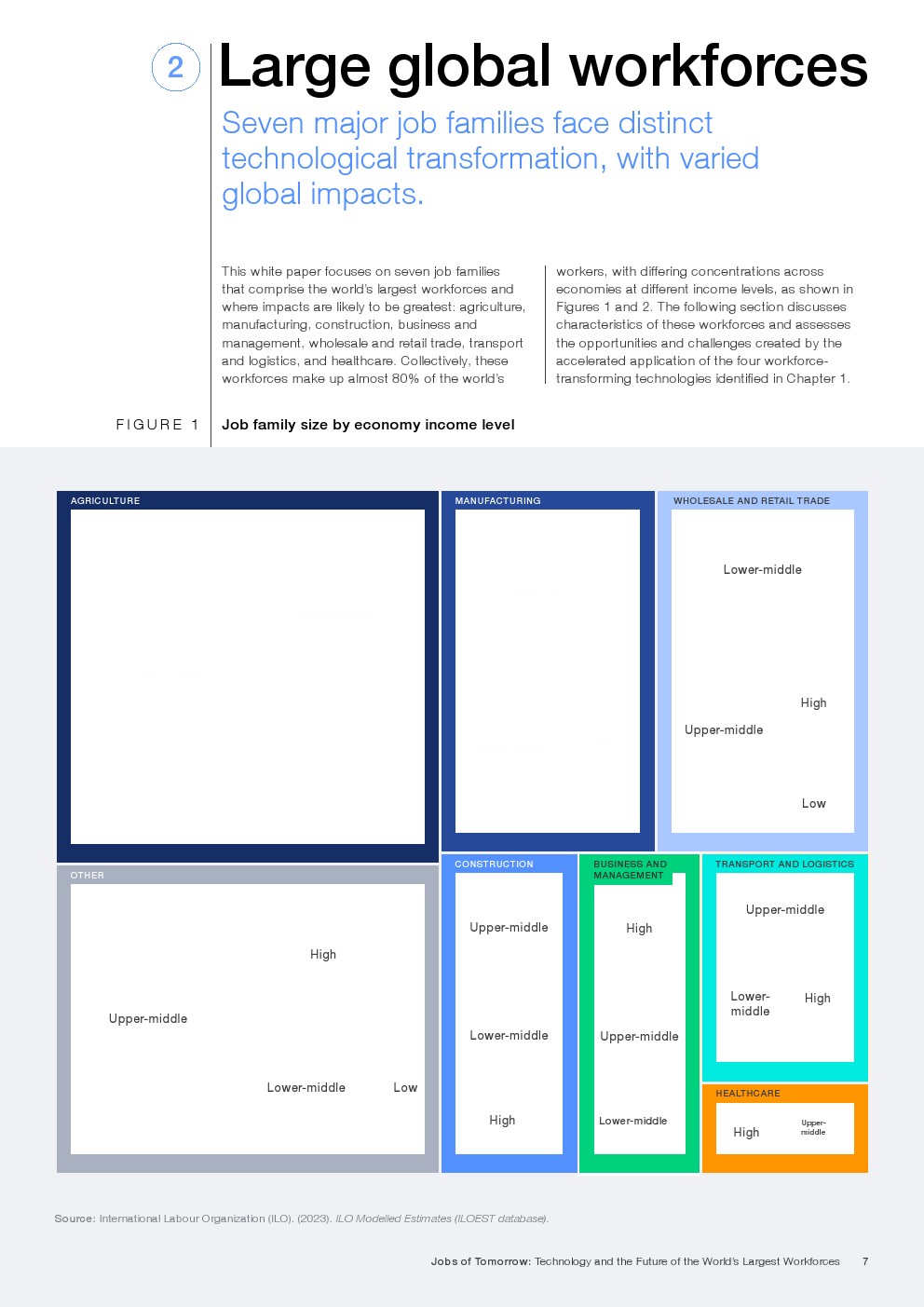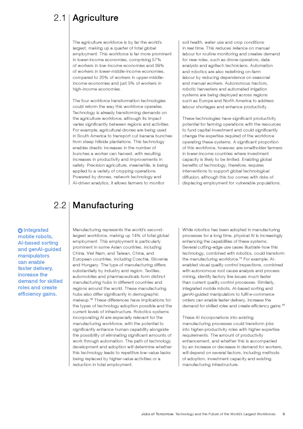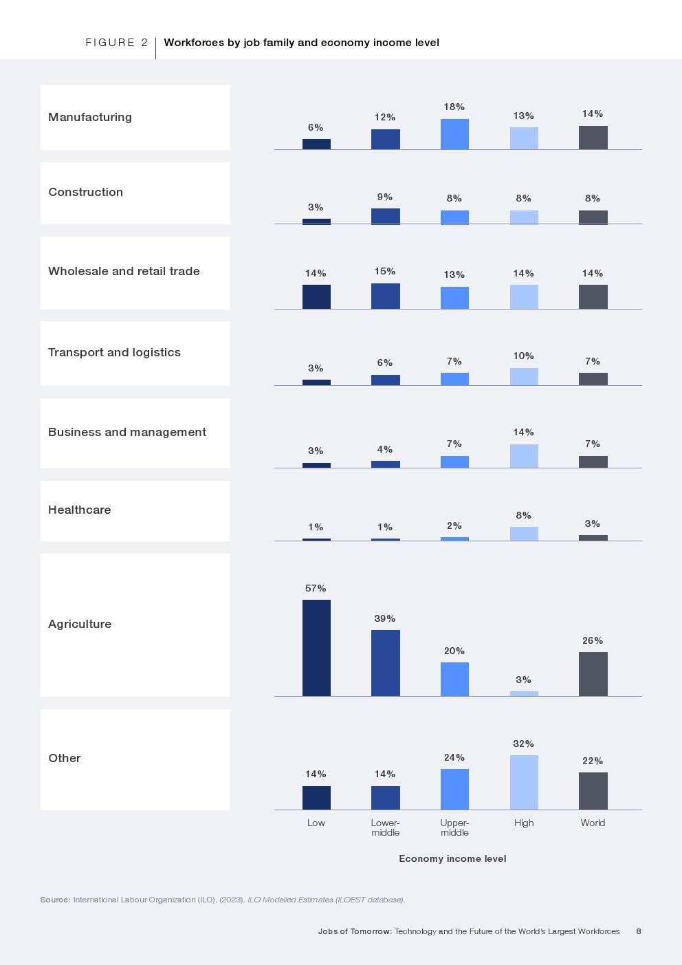 从产业结构看,农业仍占全球就业约25%,但在低收入国家占比高达57%,而高收入国家仅为3%。 技术在农业中的应用呈现明显分化:无人机、精准农业和自动化设备显著提升生产效率,同时催生数据分析与设备运维等新岗位,但资本门槛使低收入地区受益有限,技术扩散成为关键约束。