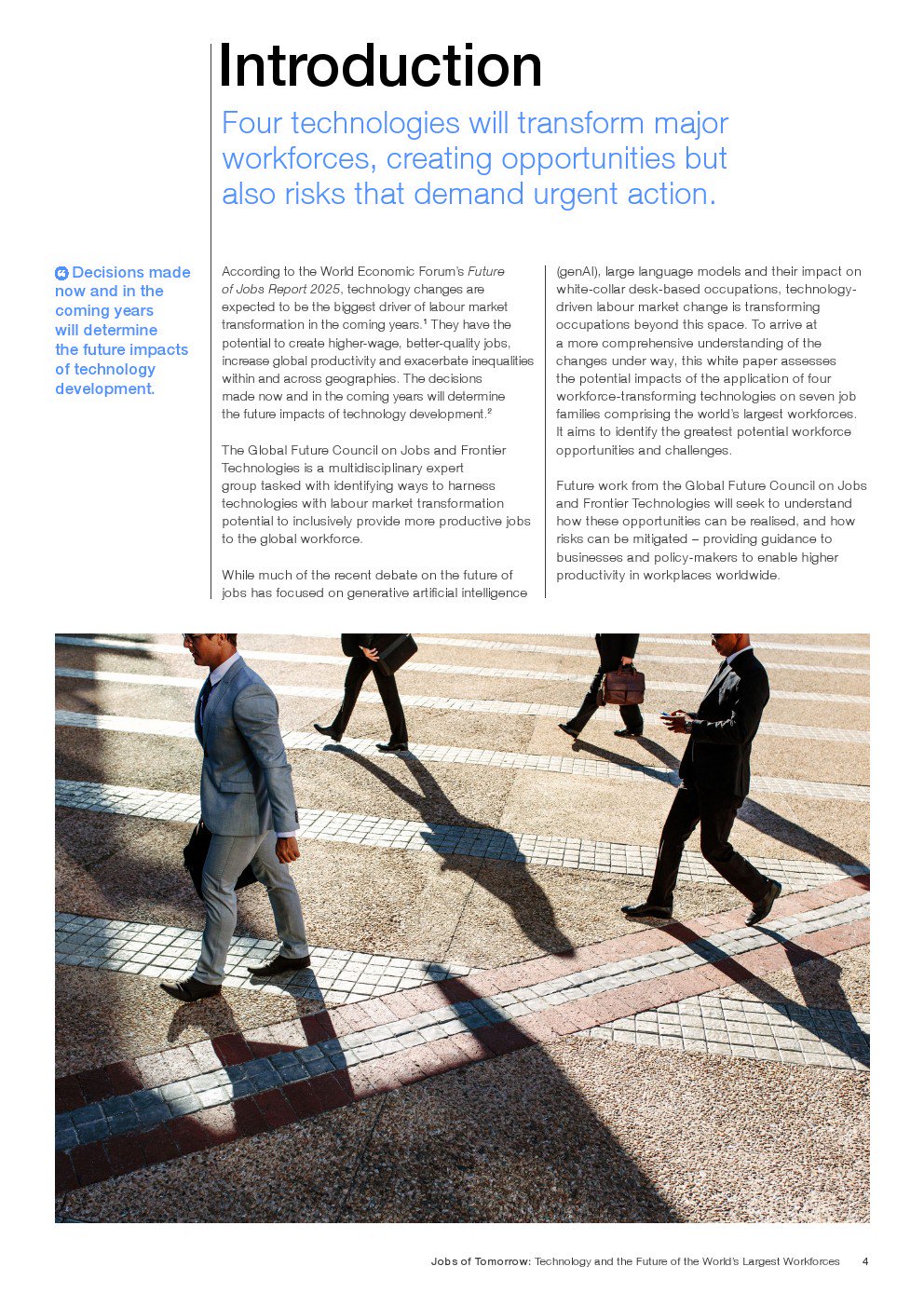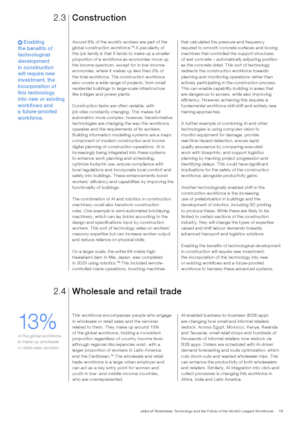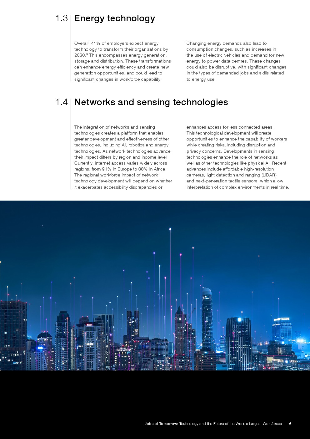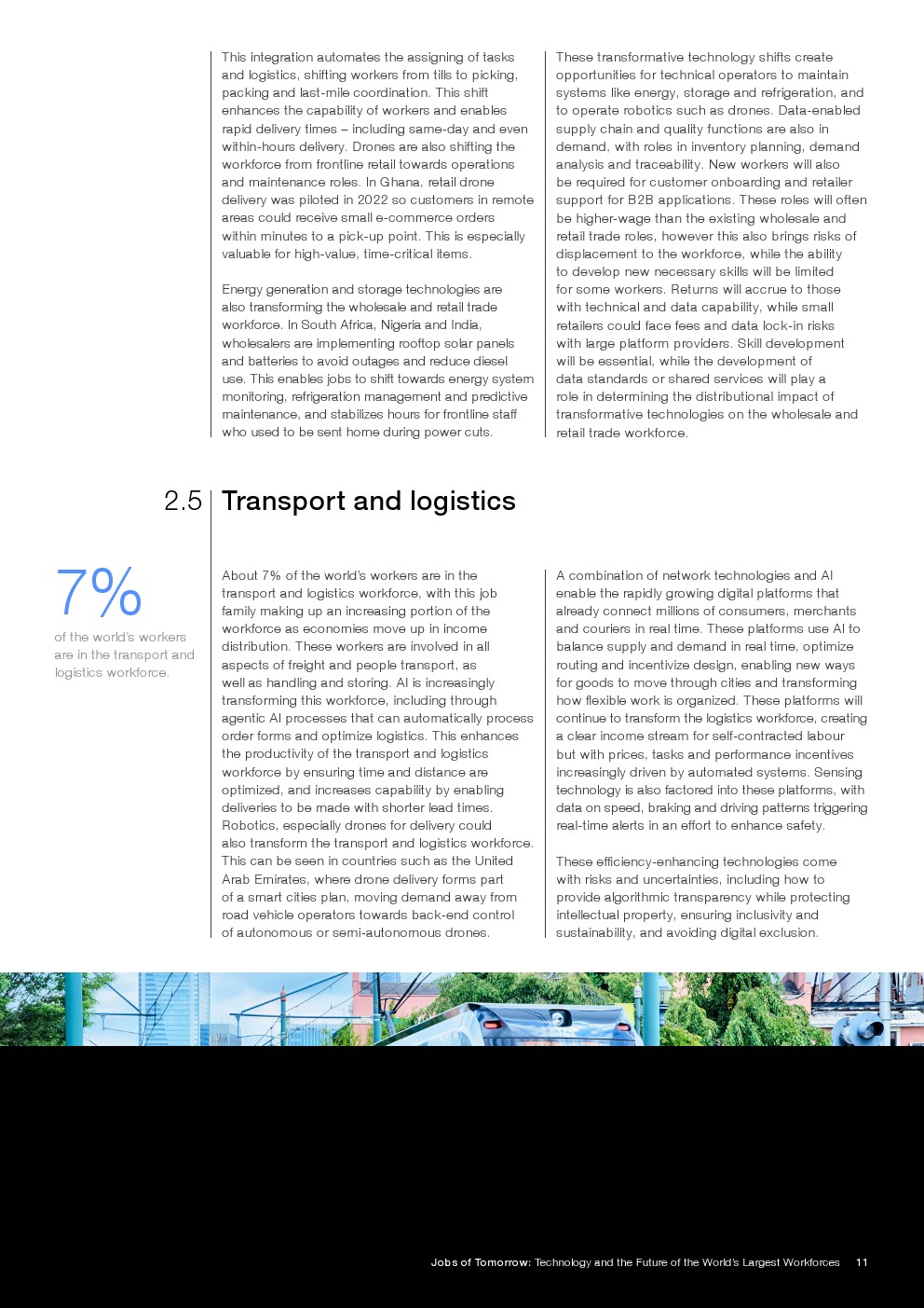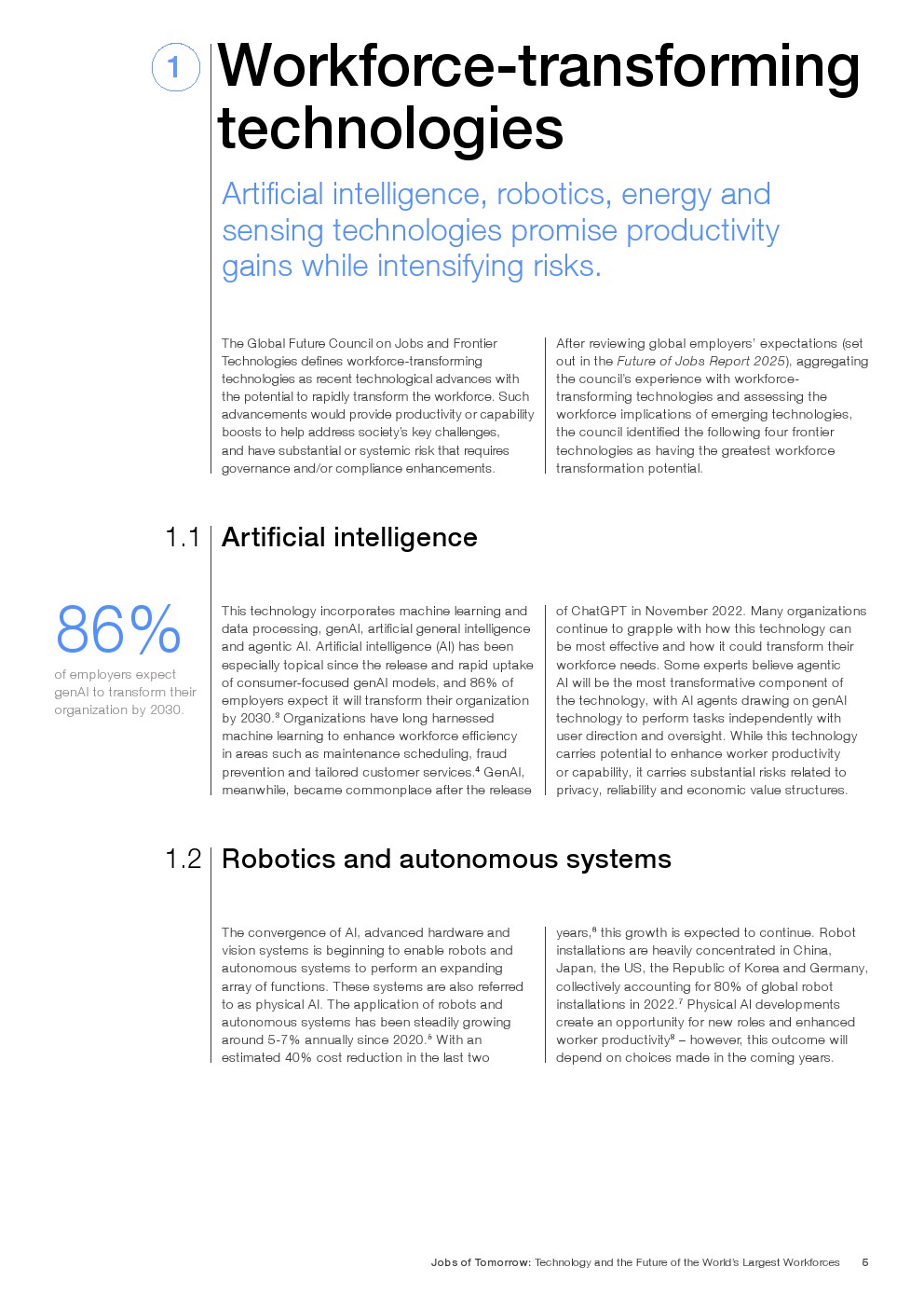 该报告显示,技术变革正成为未来劳动力市场的核心驱动力,覆盖全球约80%的就业人口,涉及农业、制造、建筑、零售与批发、运输物流、商业管理及医疗七大领域。 其中,86%的企业预计生成式人工智能将在2030年前重塑组织结构,机器人应用年均增长5%-7%,且近两年成本下降约40%,显示技术扩散正进入加速期。
