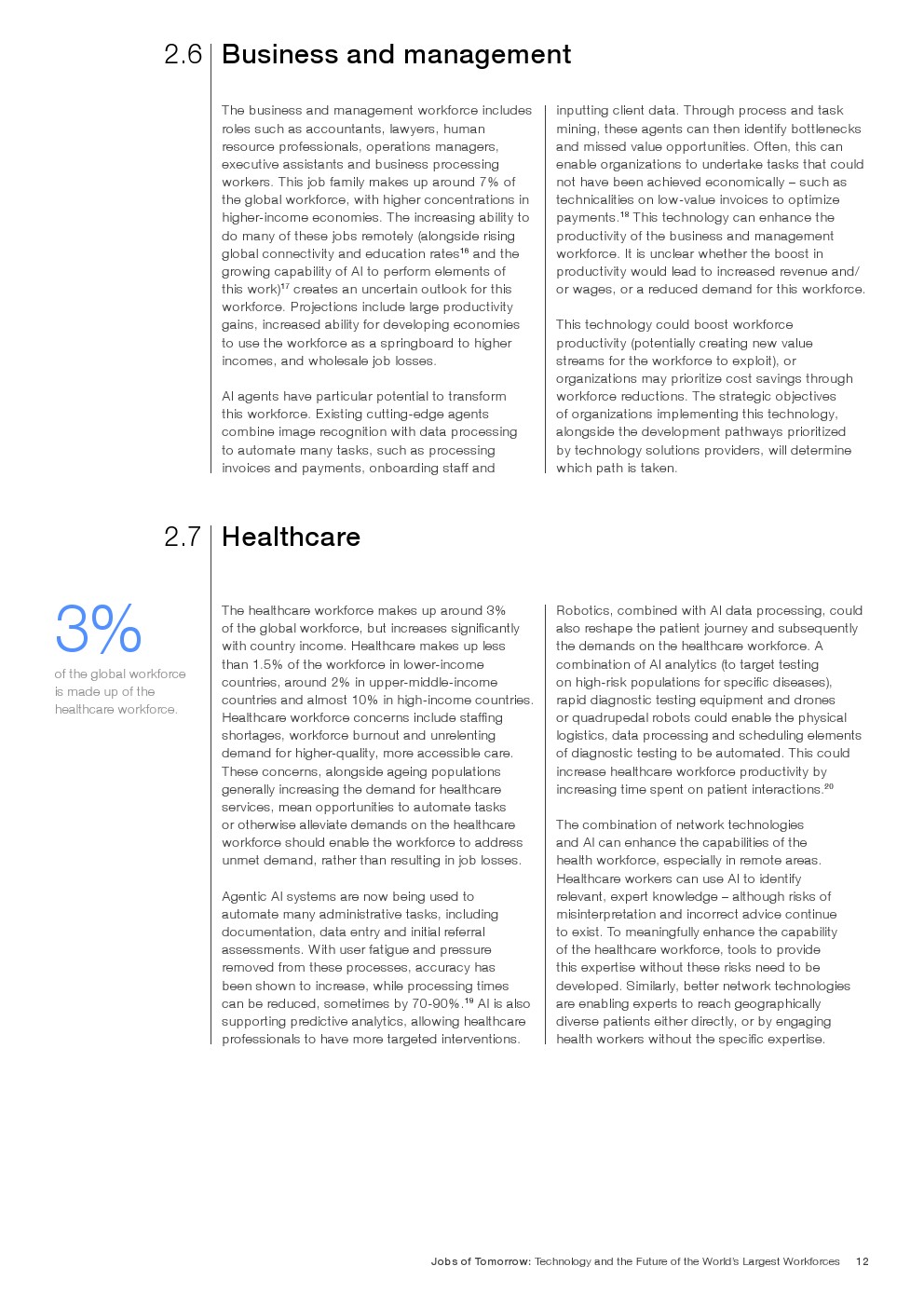 商业管理与医疗领域呈现不同逻辑。商业管理岗位约占7%,AI代理可自动处理财务、人力与客户流程,部分场景效率提升显著,但企业战略选择将决定其是扩张价值还是压缩成本。医疗领域虽仅占3%,但在高收入国家接近10%,且需求持续增长,AI应用可将行政流程效率提升70%-90%,主要用于缓解供给不足而非替代劳动力。