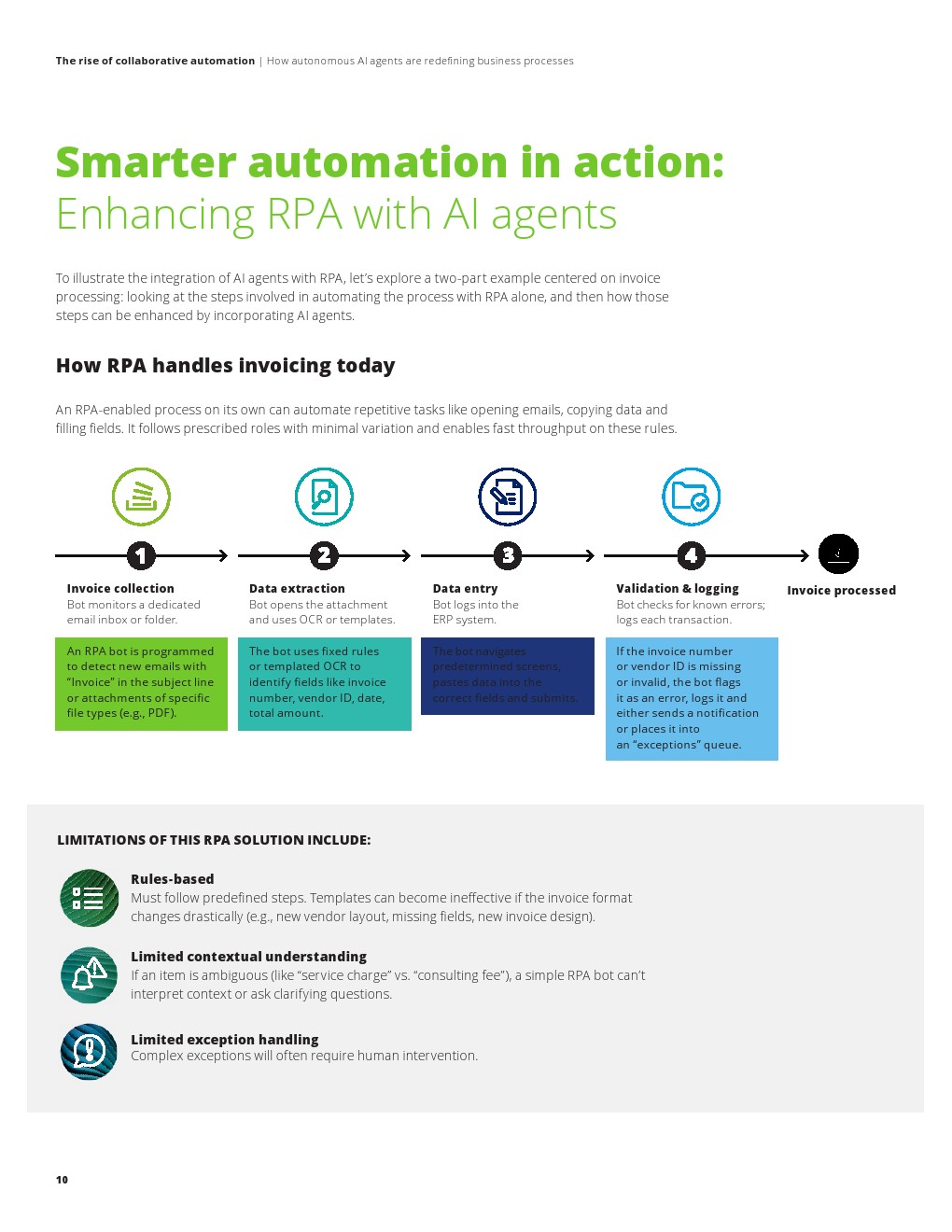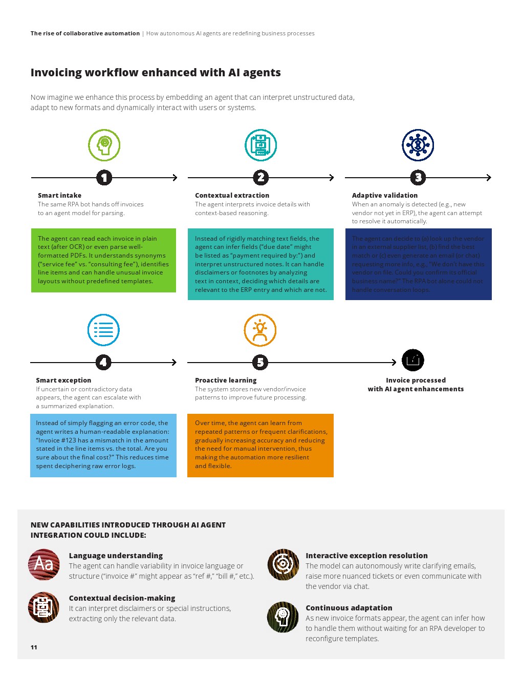 现实路径并非替代,而是协同演进。报告强调,企业当前最优策略是构建RPA与AI代理的混合架构:RPA继续承担高频、标准化操作,如数据录入与系统交互;AI代理则负责处理语义理解、异常判断与复杂决策。这种分层模式在效率、成本与风险之间形成均衡,并可在既有系统基础上实现平滑升级。在具体应用中,例如发票处理场景,AI代理可识别语义差异、自动处理异常并与外部主体交互,使自动化从“规则执行”扩展至“智能协同”,显著提升流程覆盖率与准确性。